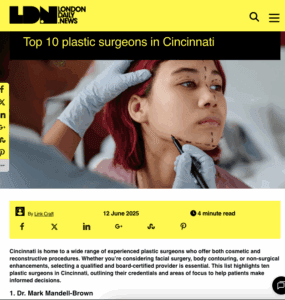 Dr. Mark Mandell-Brown has earned recognition as the number one plastic surgeon in the Tri-State. He has been voted “Best Plastic Surgeon” in Cincinnati City Beat Magazine from 2014 to 2025. He was named “Ohio’s Top Ten Plastic Surgeons’ in 2018. He has been voted a “Top Doc” in Plastic Surgery by his physician peers in Cincinnati Magazine from 2003 to 2019. He was listed #1 in the Top 10 Plastic Surgeons in the London Daily Times in 2025. He has earned recognition in Cincinnati Magazine being voted to win Best Breast Augmentation, Best Rhinoplasty, and Best Face Lifts over the past decade.