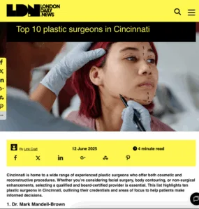 Dr. Mark Mandell-Brown has earned recognition as the number one plastic surgeon in the Tri-State. He has been voted “Best Plastic Surgeon” in Cincinnati City Beat Magazine from 2014 to 2025 and in the Cincinnati Enquirer from 2021 to 2025. He was named “Ohio’s Top Ten Plastic Surgeons’ in 2018. He has been voted a “Top Doc” in Plastic Surgery by his physician peers in Cincinnati Magazine from 2003 to 2019 and in 2025. He was listed #1 in the Top 10 Plastic Surgeons in the London Daily Times in 2025. He has earned recognition in Cincinnati Magazine being voted to win Best Breast Augmentation, Best Rhinoplasty, and Best Face Lifts over the past decade.