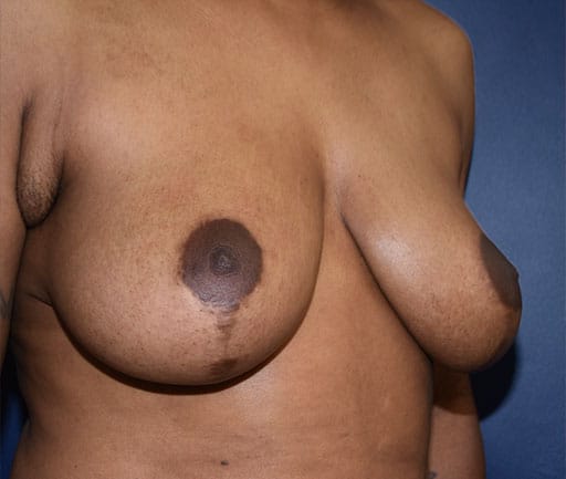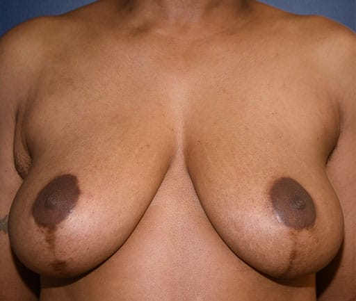 One year post-op double incision and free nipple graft by Dr Mandell-Brown. This patient had undergone a breast reduction elsewhere, but wanted to be flatter.
