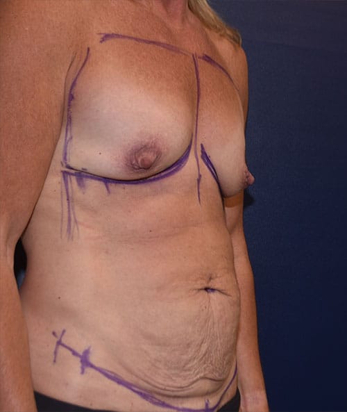 This patient underwent a Mommy Makeover, which consisted of a full tummy tuck plus a breast augmentation with 375cc high profile mentor silicone implants with Dr Mandell-Brown. She is 6 months post-op.